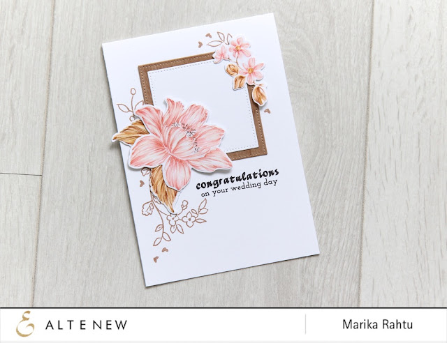 Altenew is releasing a wonderful set of new stamps and dies. I played a little with Garden Treasure stamp and Garden Treasure die set and made this wedding card for my collaque. Firstly, I stamped the flowers with Altenew Blush Crisp Die Ink onto a copic friendly card stock. Then coloured the flowers with copic markers and coloured pencils. I used a square die to die cut the two pieces of card stock that I use to create the background. I used Cherry Wood card stock and the same card stock that I used for my card base. I wanted to have to something light and beautiful on the background as well so I stamped a few leaves from an older stamp set called Precious Moments, I stamped the sentiment from Ori kami set with Altenew Jet Black Crisp die ink.